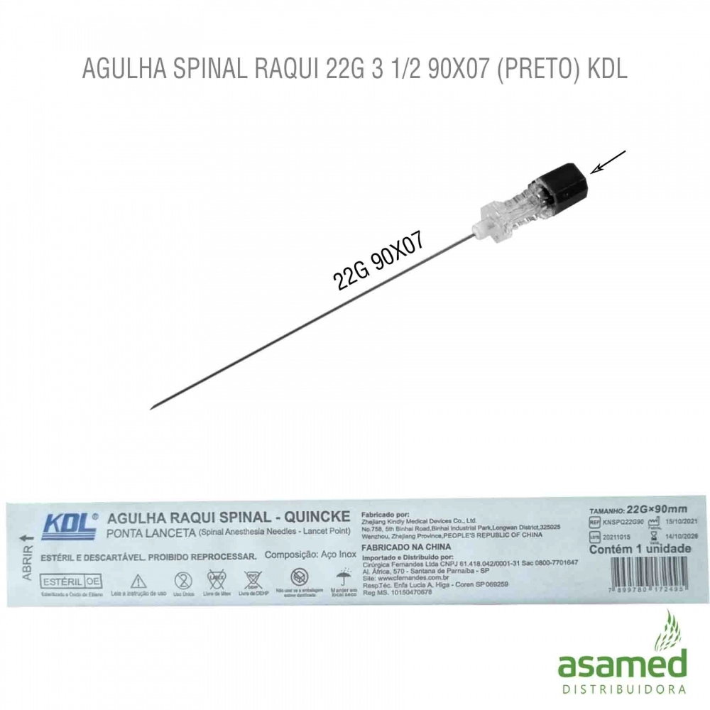As agulhas para raquianestesia ponta Quincke – KDL, são produzidas em aço inox, possuem ponta em forma de lanceta com intuito de precisão, para que haja uma inserção atraumática, além de promoverem a redução da cefaleia pós-punção dural. Seu estilete em aço inox com a extremidade proximal colorida para identificação da numeração, canhão com conector tipo luer, transparente permitido fácil visualização do retorno de LCR. Estéril, embaladas individualmente.