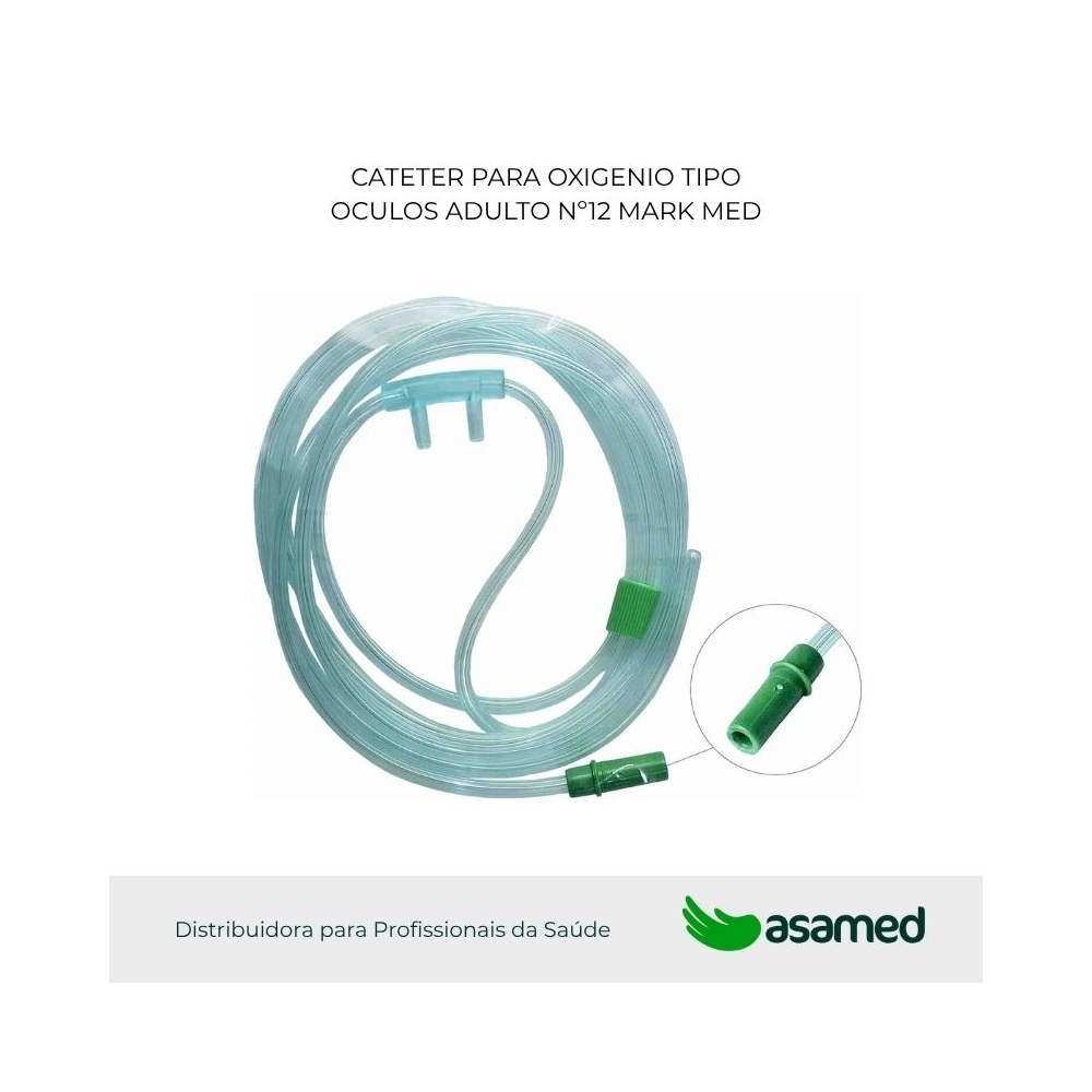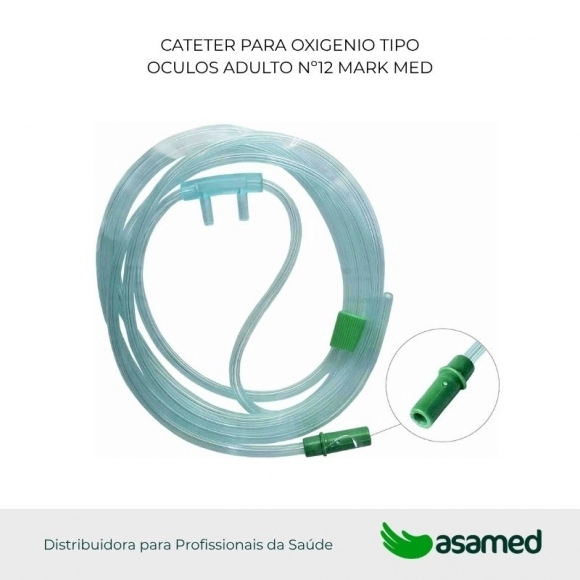 O produto Cateter para oxigênio tipo Oculos – Mark Med é um cateter confeccionado em tubo de PVC, atóxico, apirogênico, verde, transparente de paredes finas e maleáveis, nos calibres: 08 e 12, com tubo principal de PVC de 90, 150 e 210 cm de comprimento, com conector “Y” ligado ao conector nasal através de dois tubos de acesso nasal de PVC de aproximadamente 50 cm e provido, na outra extremidade, de um conector padrão, totalizando 140, 200 e 260 cm de comprimento. As apresentações do produto serão embaladas individualmente em envelopes confeccionados em papel grau cirúrgico, identificado, contendo 01 unidade e acondicionado em caixa de papelão. Esterilizado por Radiação Ionizante, com validade de 4 anos a partir da data de fabricação do lote, desde que a embalagem não tenha sido violada.
