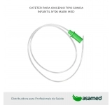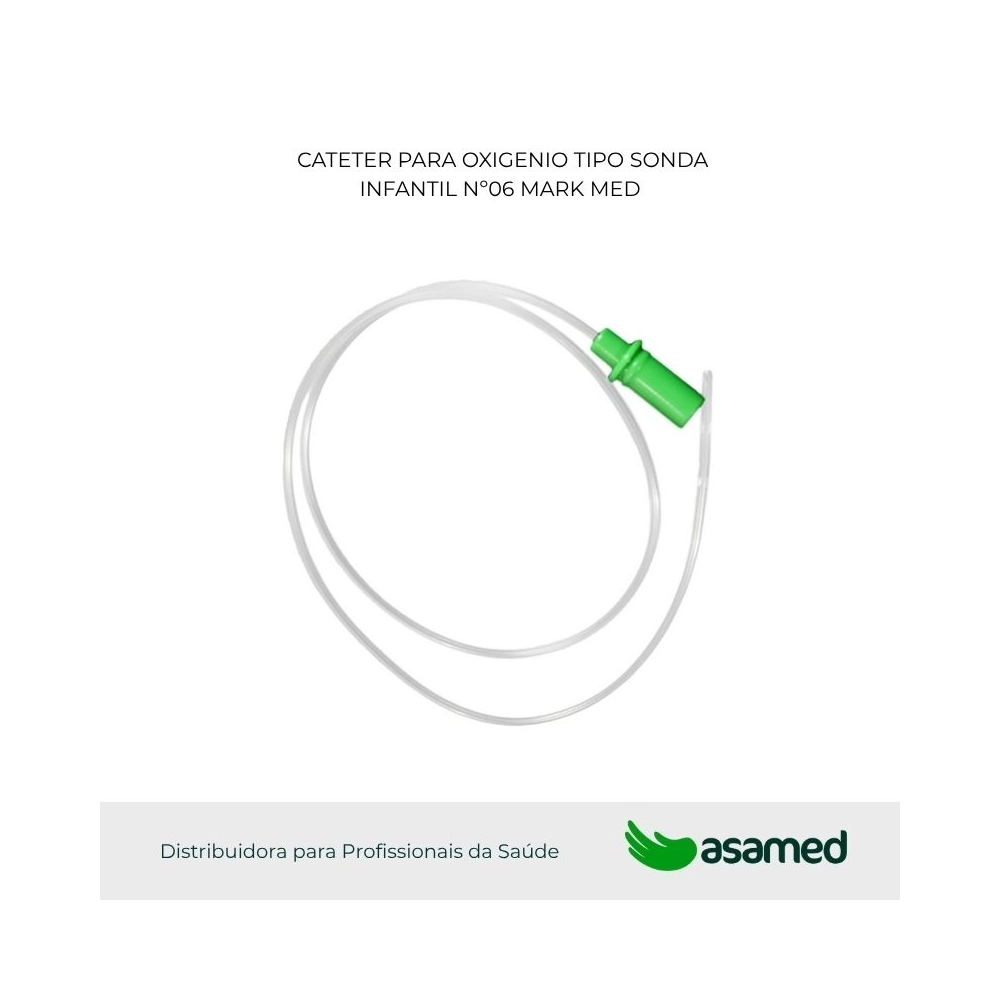 O produto Cateter para oxigênio tipo Sonda – Mark Med é um cateter confeccionado em tubo de PVC, atóxico, apirogênico, verde, transparente de paredes finas e maleáveis, com 40 cm de comprimento nos calibres: 04, 06, 08 (uso infantil) 10, 12, 14, 16 e 18 Fr (uso adulto) com ponta arredondada e fechada, com 4 furos laterais e provida na outra extremidade de um conector padrão; As apresentações do produto serão embaladas individualmente em envelopes confeccionados em papel grau cirúrgico, identificado, contendo 01 unidade e acondicionado em caixa de papelão. Esterilizado por Radiação Ionizante, com validade de 4 anos a partir da data de fabricação do lote, desde que a embalagem não tenha sido violada.