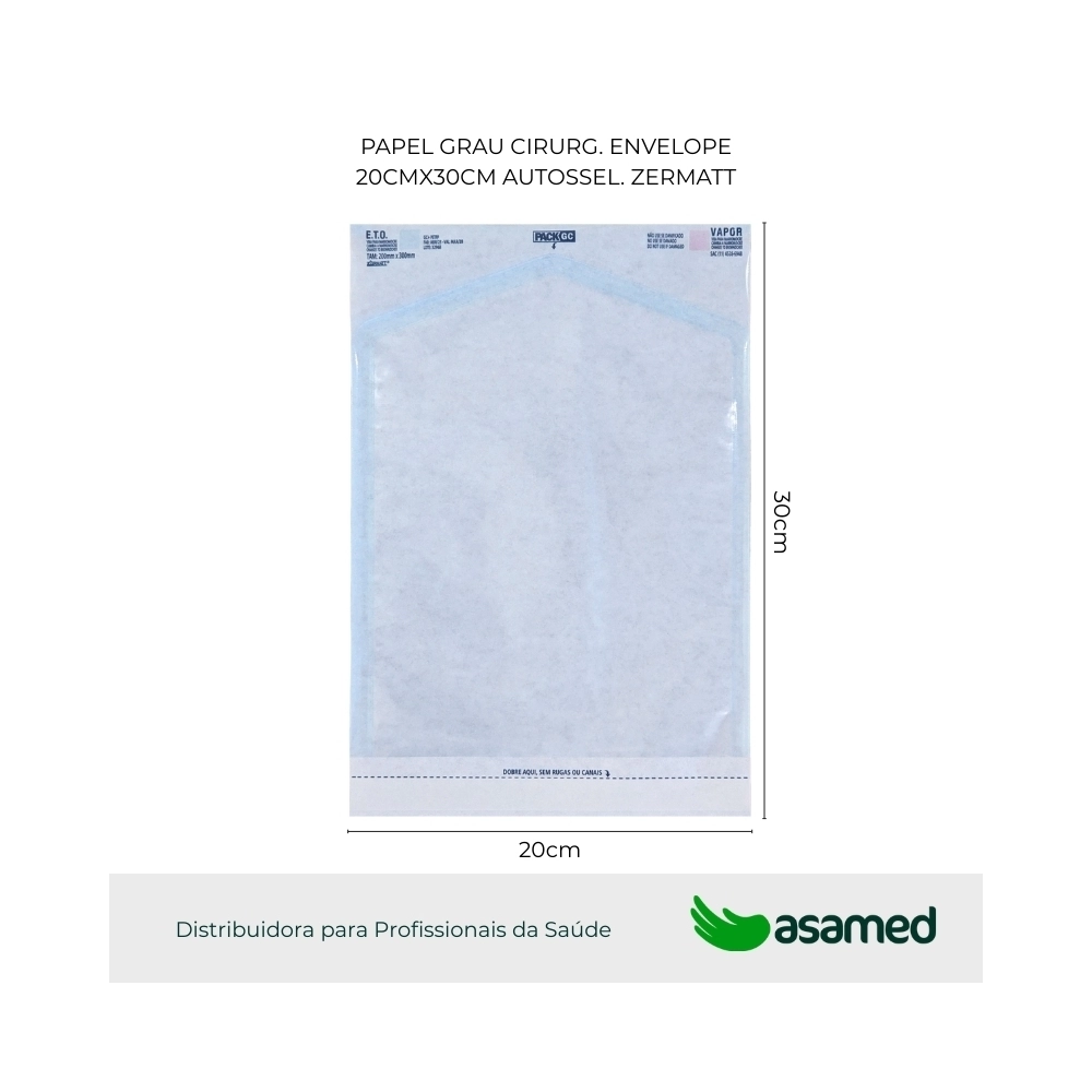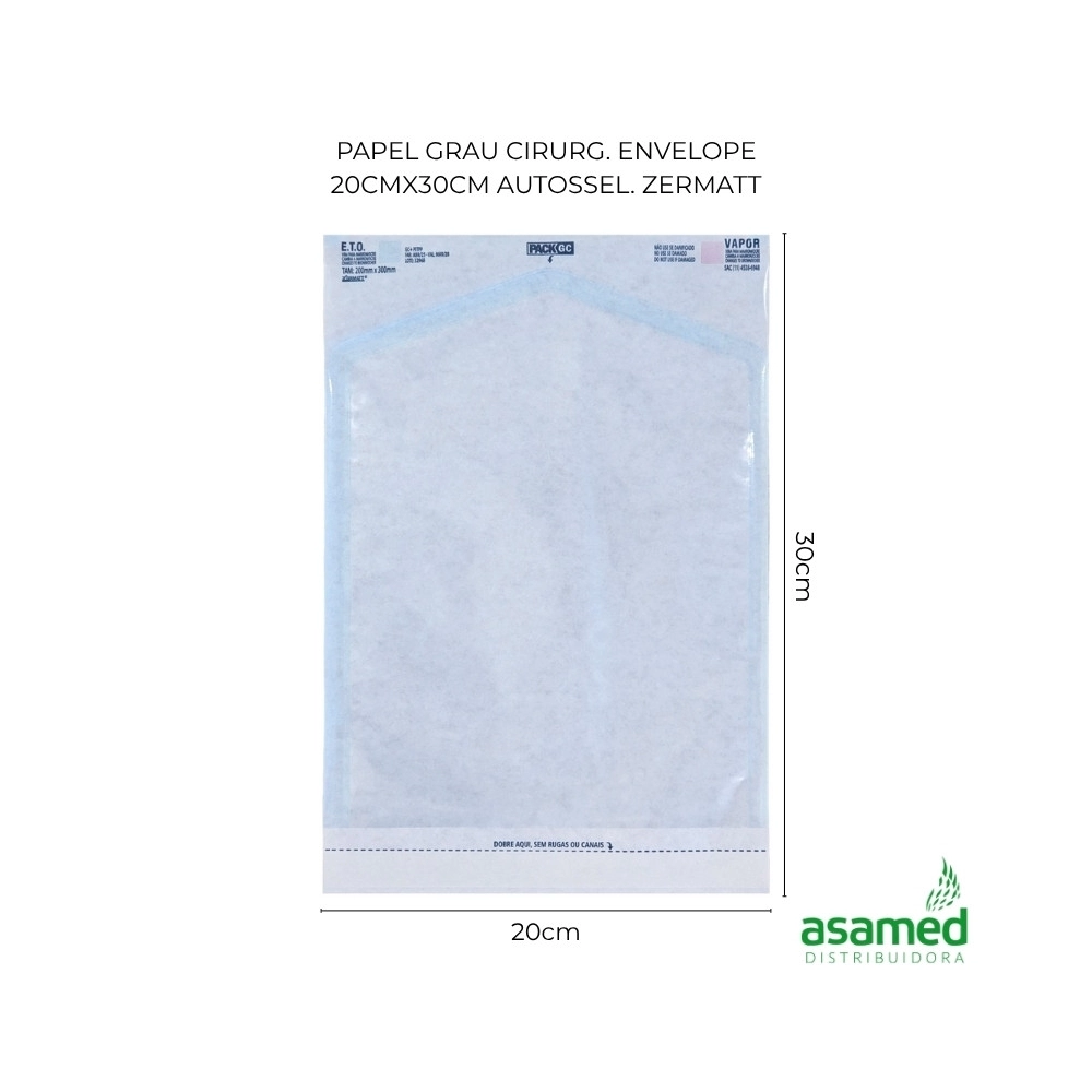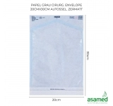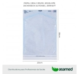 Envelope Autosselante com impressão de dois indicadores químicos para monitoração do processo de esterilização óxido de etileno (ETO) e autoclave a vapor (VAPOR), informações como o número de lote, fabricação, validade, fabricante, símbolo de não reutilizável, indicação com sentido de abertura e Serviço de atendimento ao cliente (SAC). Presença de fita adesiva dupla face para selagem manual da embalagem.