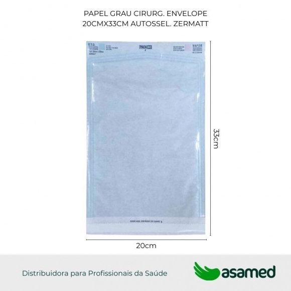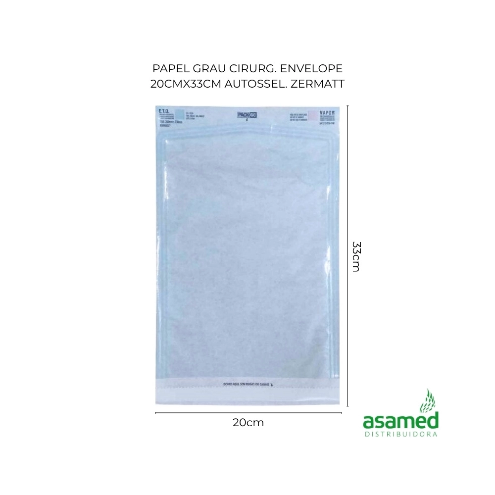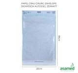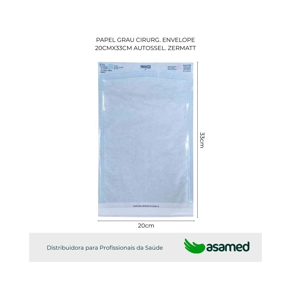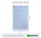 Envelope Autosselante com impressão de dois indicadores químicos para monitoração do processo de esterilização óxido de etileno (ETO) e autoclave a vapor (VAPOR), informações como o número de lote, fabricação, validade, fabricante, símbolo de não reutilizável, indicação com sentido de abertura e Serviço de atendimento ao cliente (SAC). Presença de fita adesiva dupla face para selagem manual da embalagem.