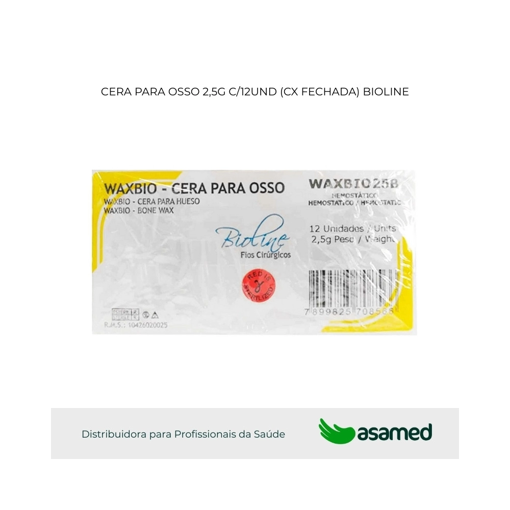 A WaxBio - Cera para Osso é um hemostático cirúrgico estéril, industrializado com uma combinação de cera de abelha alvejada e Palmitato de Isopropila, agindo com ação emoliente. Sua apresentação é em forma de bastão, de cor ligeiramente amarelada e com odor característico. São acondicionadas individualmente em embalagens estéreis. A WaxBio - Cera para Osso atende as especificações estabelecidas pela Farmacopéia Brasileira, pela United States Pharmacopeia (USP) e pela Farmacopéia Européia (EP). Sua esterilização é feita com Radiação Gama (Cobalto 60).