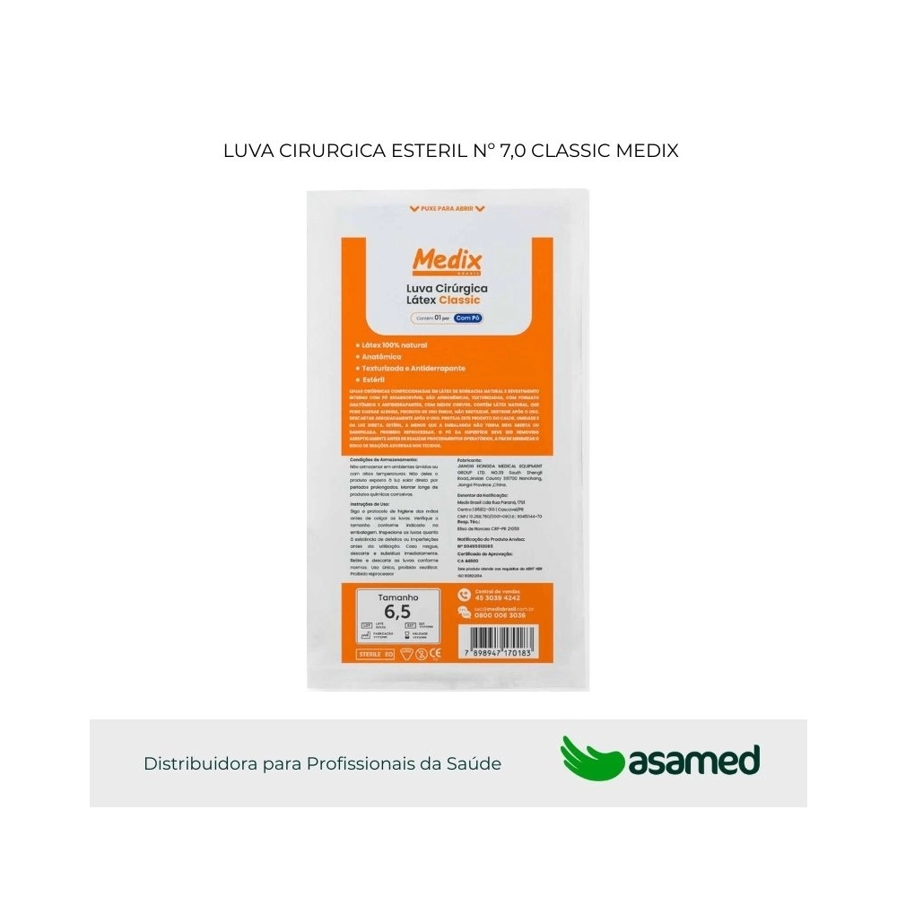 Confeccionado em látex de borracha natural e revestimento interno com pó bioabsorvível. As luvas são apirogênicas, texturizadas, com formato anatômico e antiderrapante, com dedos curvos.