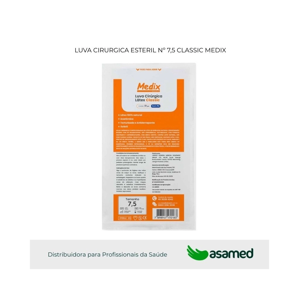 Confeccionado em látex de borracha natural e revestimento interno com pó bioabsorvível. As luvas são apirogênicas, texturizadas, com formato anatômico e antiderrapante, com dedos curvos.