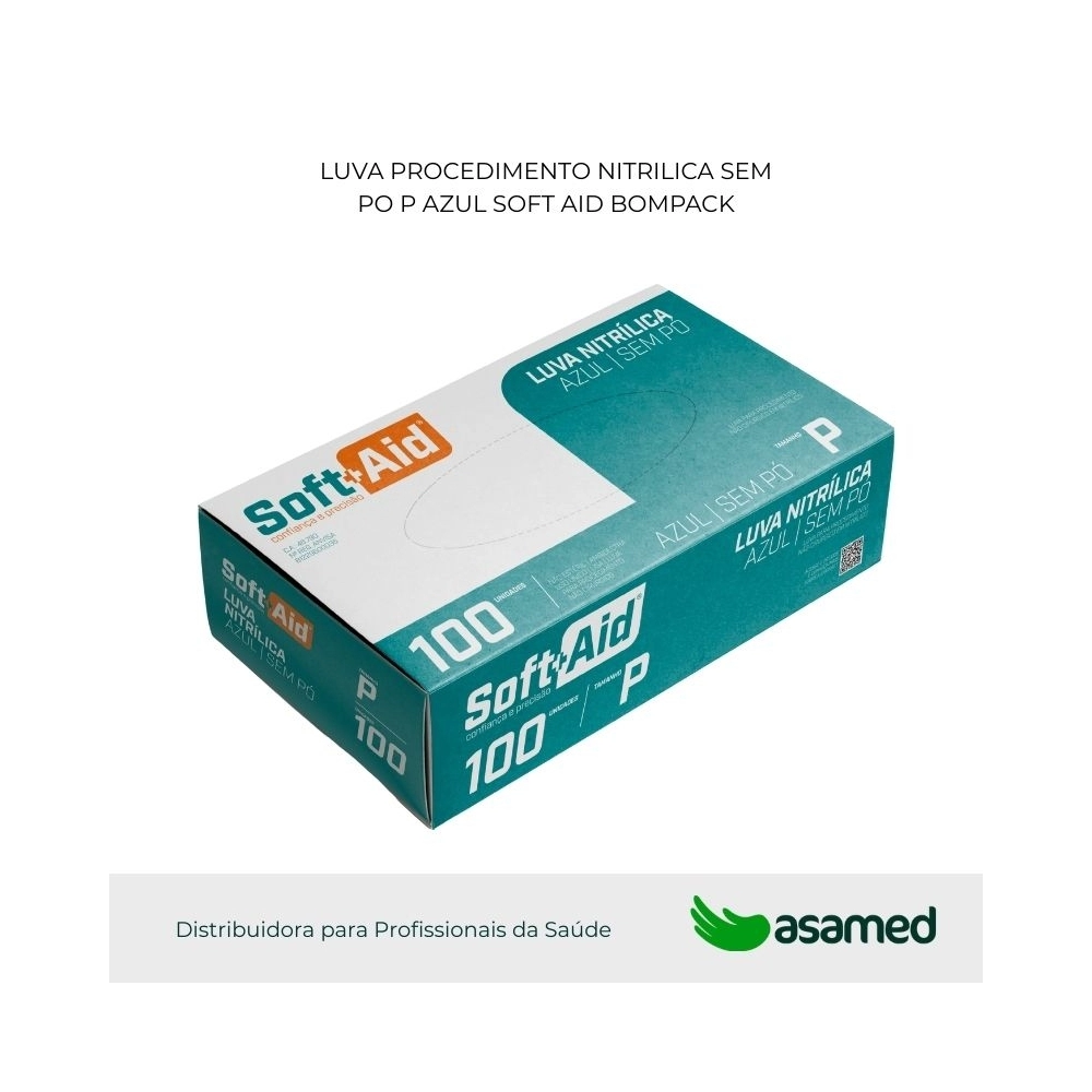 Luva nitrílica SOFT+AID sem pó é confeccionada em borracha nitrílica (NBR, polímero de acrilonitrila e de butadieno). Lisa, ambidestra, de uso único, hipoalergênica, sem látex, com virola no punho, pontas dos dedos texturizada, não esterilizada e com virola no punho.