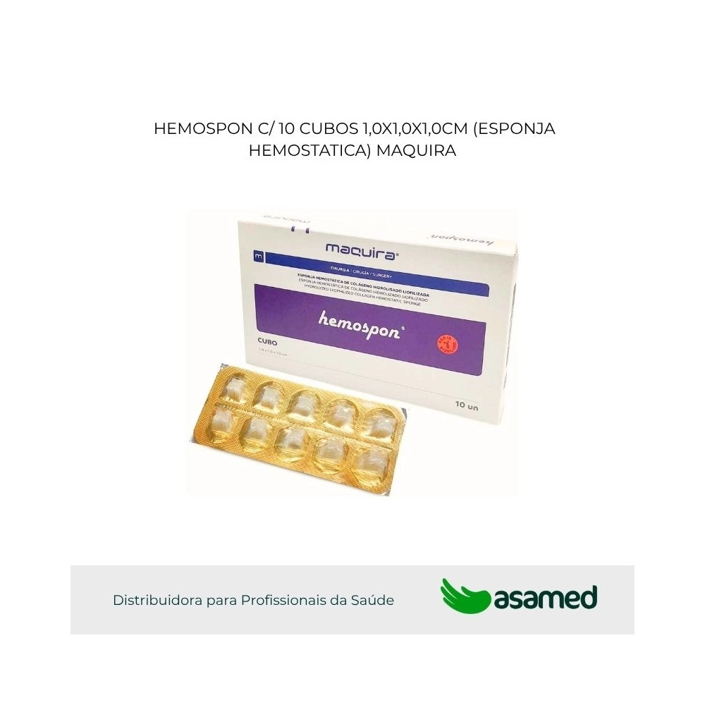 • Hemospon 1,0 x 1,0 x 1,0cm: atua na manutenção do coágulo e no preenchimento dos espaços gerados nas extrações dentárias convencionais, remoções de dentes inclusos ou impactados, remoções de cistos ou tumores, biópsias, etc.
