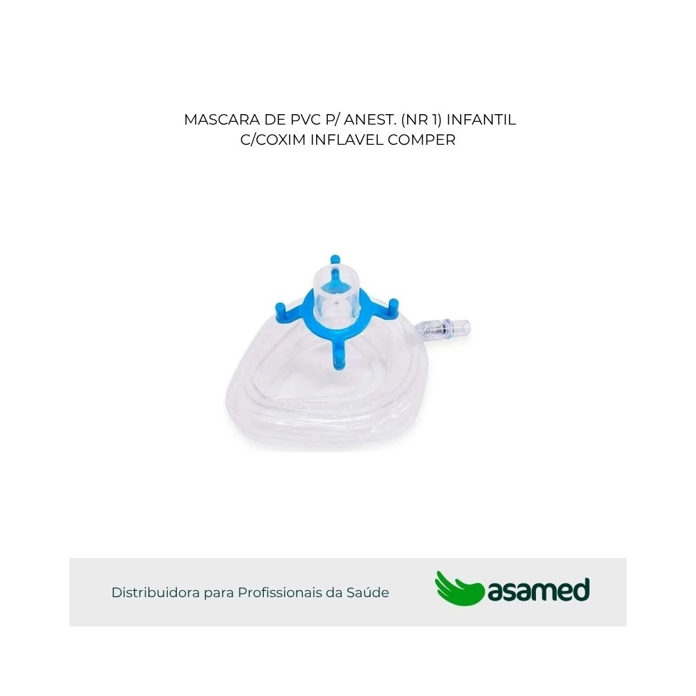 A máscara de anestesia com coxim inflável Comper é indicada para administração de oxigênio e gás de anestesia ao paciente. Máscara facial em PVC, descartável, formato anatômico e coxim inflável com Válvula de Segurança. Acompanha anéis retentores para fixação.