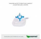 Máscara facial em PVC, descartável, formato anatômico e coxim inflável com válvula de segurança, acompanha anéis de fixação para retenção.