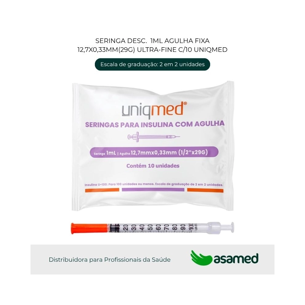 As Seringas para Insulina com Agulha - Uniqmed são produtos de finalidade médica, para administração de medicamentos como a insulina e consistem em um tubo graduado e um êmbolo móvel, conectados a agulhas.