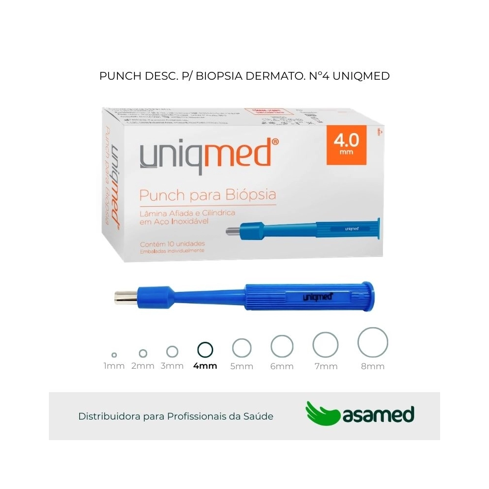 O Punch para Biopsia Uniqmed é constituído de uma lâmina em aço inoxidável, afiada e cilíndrica, acoplada a um cabo plástico